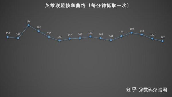 首先是英雄联盟,作为一款经典之作,它对我们电脑的硬件配置要求最低的一款,通过每分钟抓取一次帧数记录,得到了以下成绩,帧数均在150帧左右,游戏运行完全无任何压力。