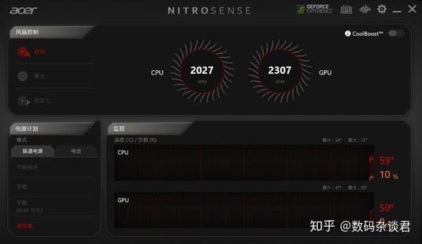 同时暗影骑士 · 擎系统自带的NitroSense控制感应系统,可以帮助我们更好的管理我们的电脑,软件本身除了可以监控CPU/GPU的温度之外,还可以控制风扇的转速,拥有自动、最大、自定义等多种模式可供选择,而我们在自动模式下可以开启CoolBoost风扇增压系统,可以让风扇的转速提升10%左右,更利于笔记本的散热。