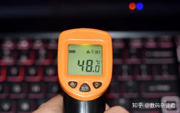 拷机结束笔者也是通过红外检测器对笔记本的表现温度进行了一个检测,发现笔记本的最高温度区域在键盘的中间位置,达到了48度,用手去触摸有热感很明显,不过在静置了一会儿之后,笔记本的表面温度也是快速的降了下来。