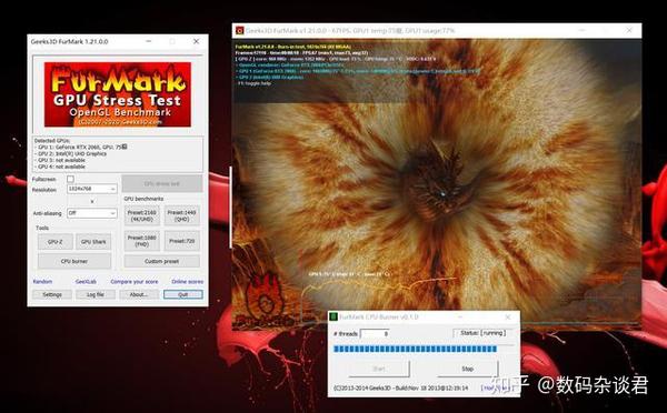 游戏测试完之后,笔者随后也是进行了拷机测试,通过FURMARK甜甜圈进行了半个小时的极限测试,来观察笔记本CPU和显卡的温度,而这样的测试除了可以验证笔记本在极限使用条件下的稳定性,还可以验证笔记本的散热能力。